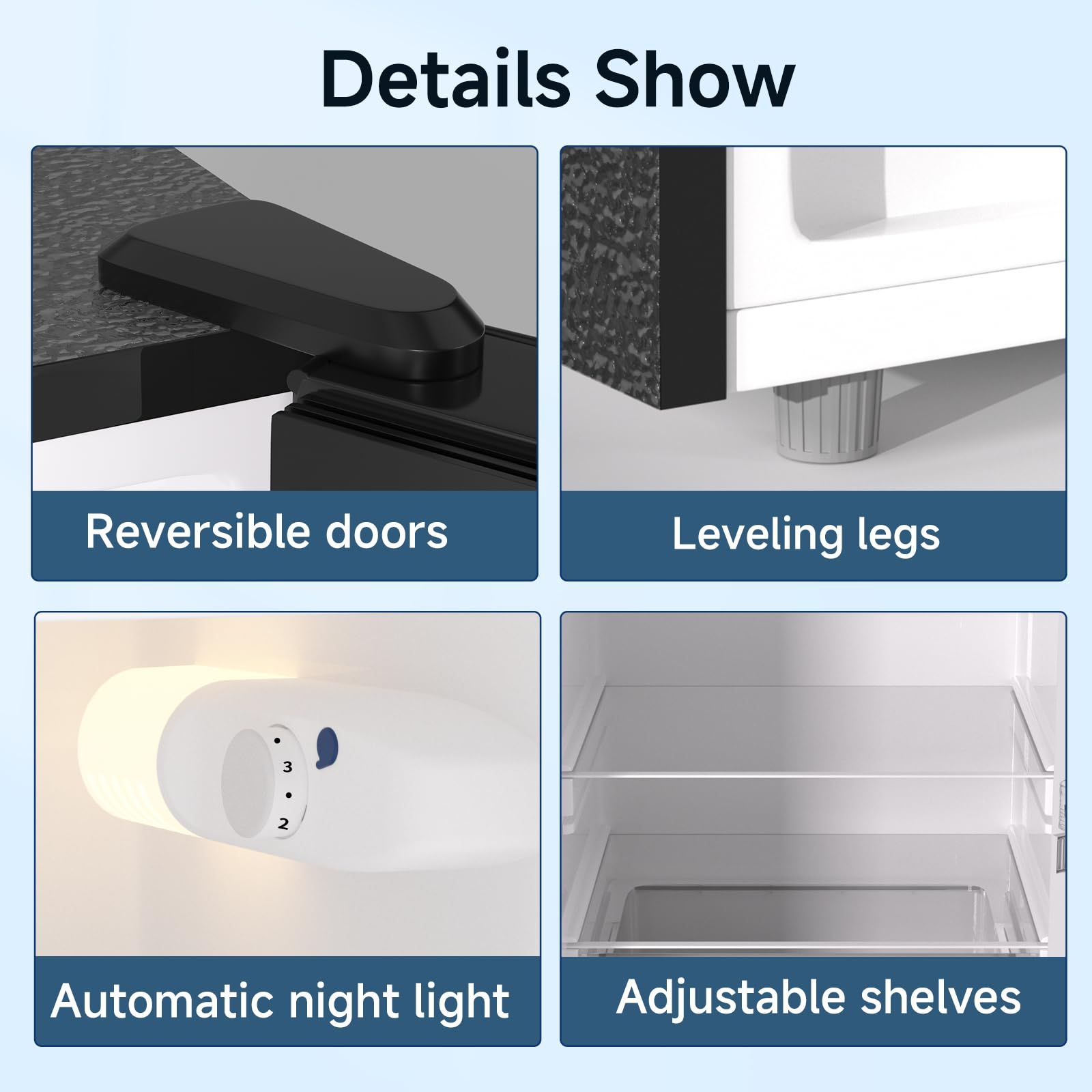 BANGSON apartment size fridge comes with reversible doors to fit your preference. The automatic night light in the refrigeration compartment makes it easy to locate items in the dark. The bottom leveling legs allow it for stable placement on uneven surfaces. It also includes an ice tray, a defrost tool, and an egg shelf.