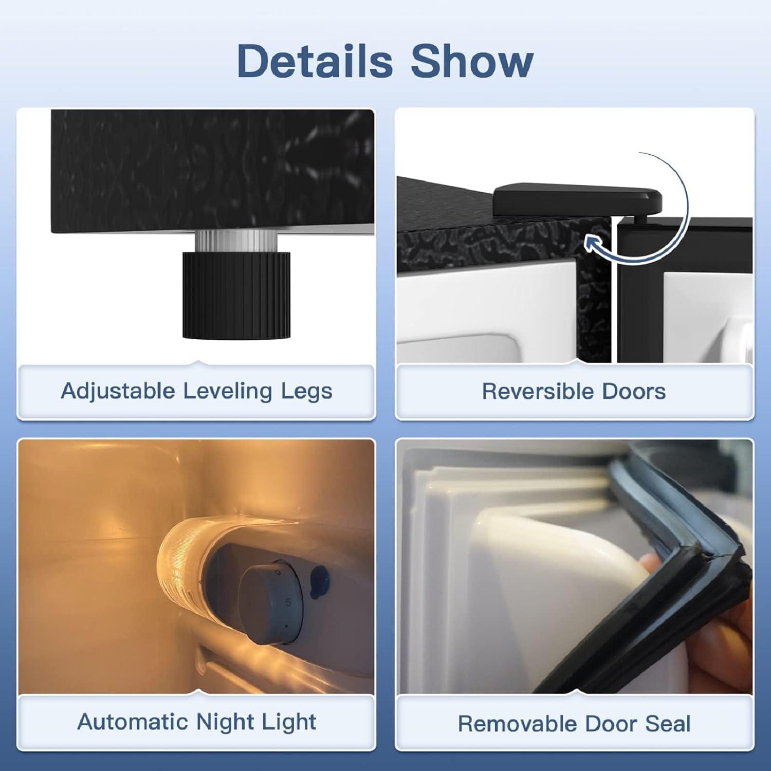BANGSON's compact fridge comes with reversible doors to fit your preference. The automatic night light in the refrigeration compartment makes it easy to locate items in the dark. The bottom leveling legs allow it for stable placement on uneven surfaces. The removable door seal makes cleaning a breeze. It also includes an ice tray and a defrost tool.